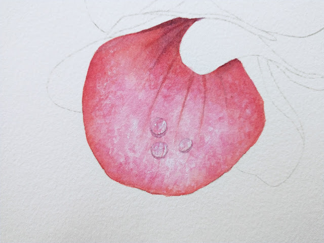 When everything was dry I also ran a wet brush over the shadows furthest from the flower to soften and lighten the edges of the petal shadows far away from the flower and the furthest side of the stem shadow. I dried it with a paper towel. I will most likely do one more pass on this to soften, blend and adjust values and colors. Then I will move on to the flower.